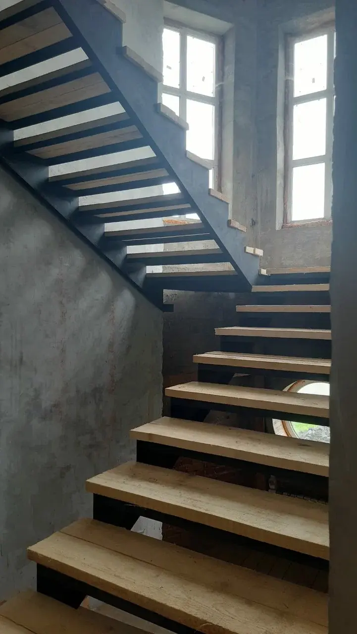 Лестница открытого типа на пилообразном косоуре в дереве